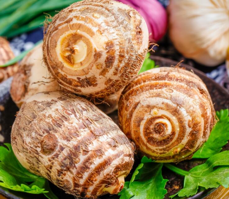 2.芋头:芋头含蛋白质、钙、磷、铁、钾、镁、钠、胡萝卜素、烟酸、维生素C、B族维生素、皂角甙等多种成分,所含的矿物质中,氟的含量较高,具有洁齿防龋、保护牙齿的作用。而且它属于碱性食品,调整人体的酸碱平衡,产生美容养颜、乌黑头发的功效。